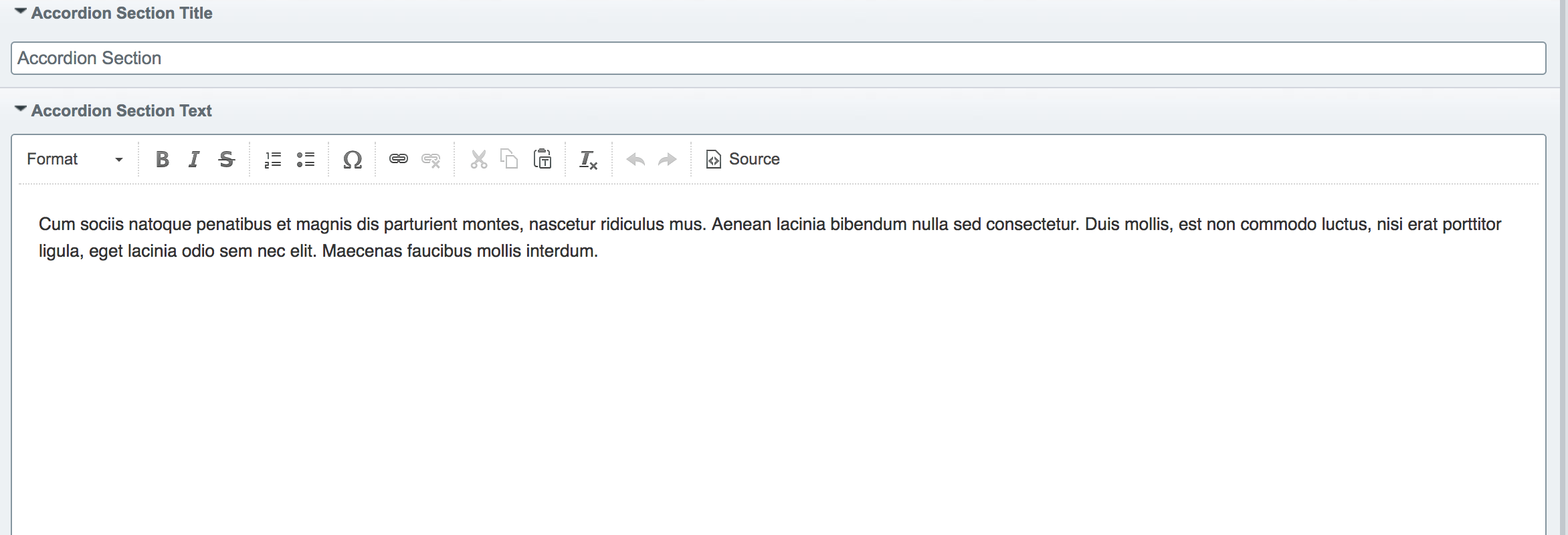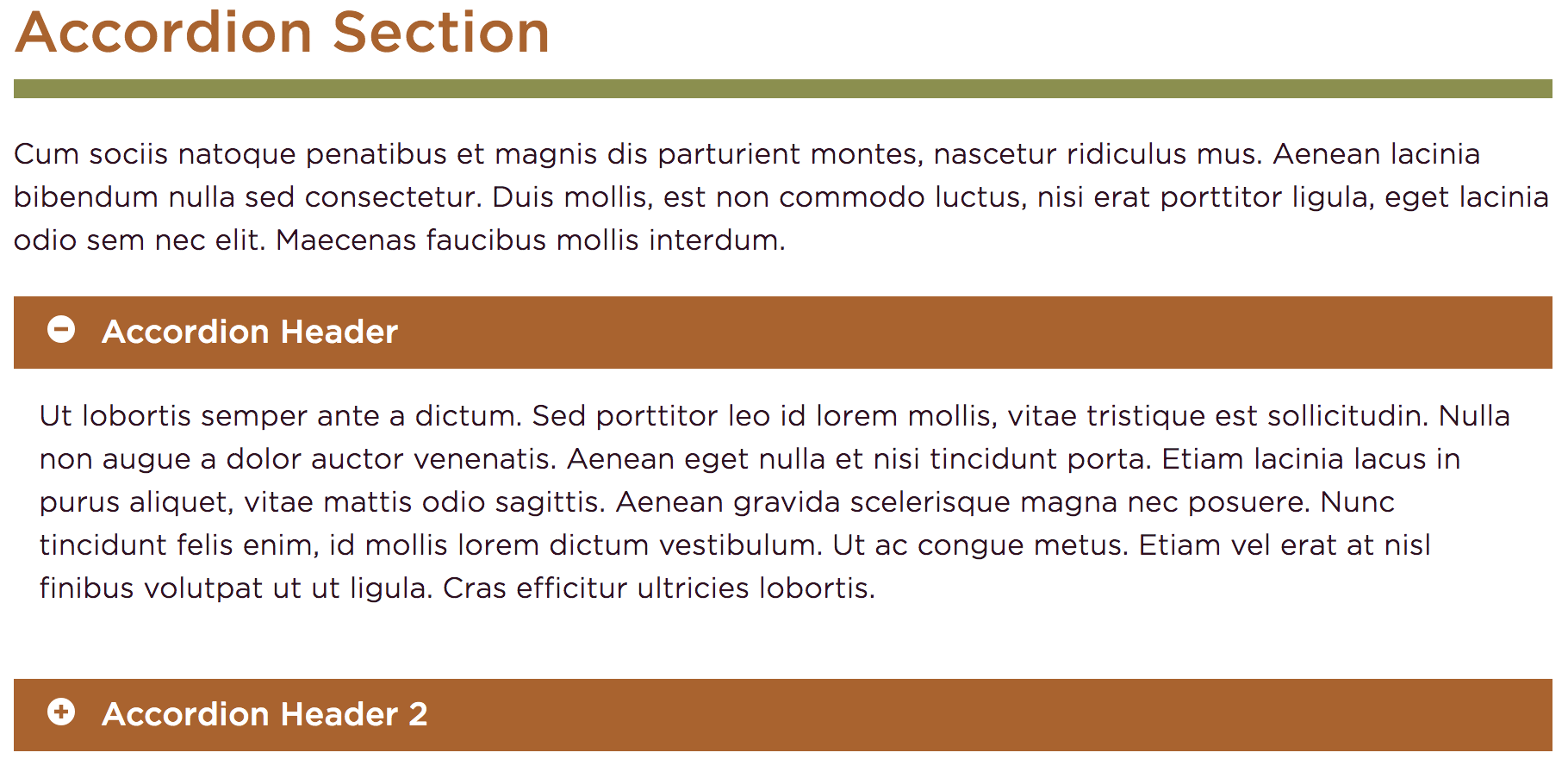 This image shows the Section title, Section text, and two accordion content rows, one open and one closed.