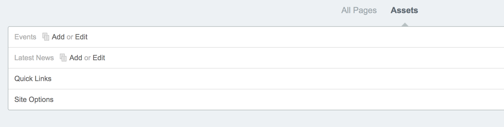 On the assets tab you also have a "Quick Links" section. To make quick links display make sure the status is set to open. Quick links will show in a bar at the very top of your site next to the search bar. The words "Quick Links" will display. If you click on those words, a list of links will appear as a pop-up. These links can be internal or external to your site.