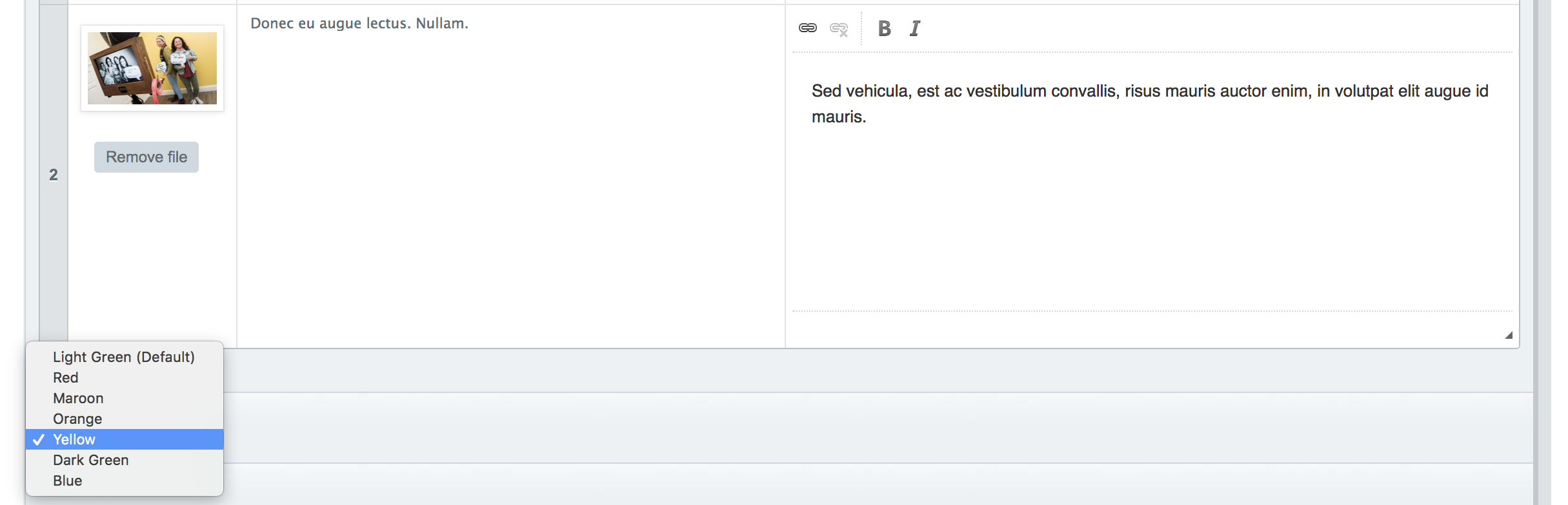 Next is a pullout quote section. Again this is a basic text box. The image shows how it is displayed. There is a dropdown option to change the background color below the section.