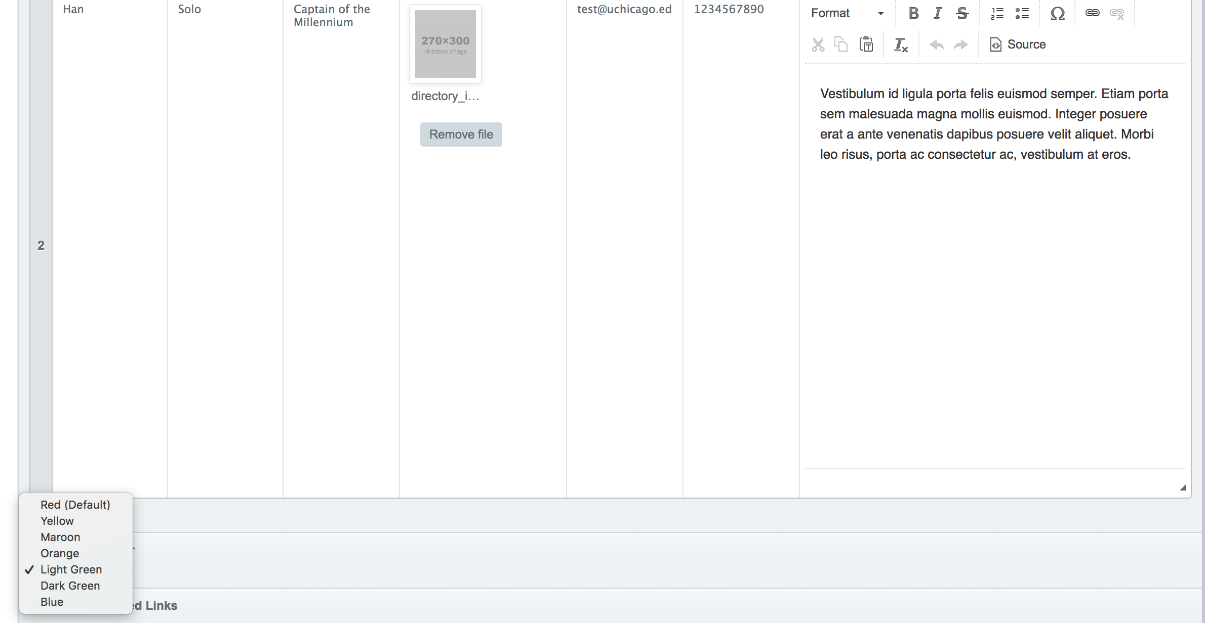 Scrolling down you'll find a directory section. Using this you can create a person bio. The fields first, last, and title are required. There are options to insert an image, email, phone, and bio.