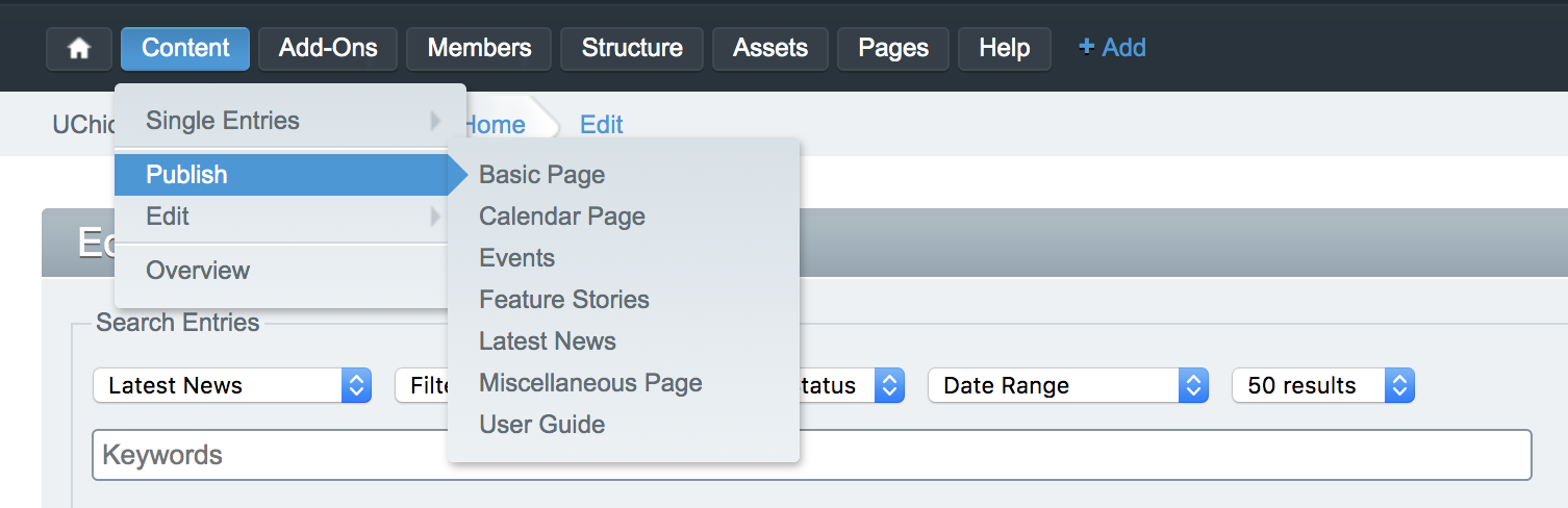 News entries appear both on the Homepage and on the /news page. The Homepage only displays previews for one featured news story and two of the most recent non-featured stories, while the /news page displays an entire archive. To create or edit a news entry, go to the "Content" section of the top bar, and hover over "Publish" and then click "Latest News" to create a new story. To edit a story, go to the "Content" section of the top bar, and hover over "Edit" and then click "Latest News".