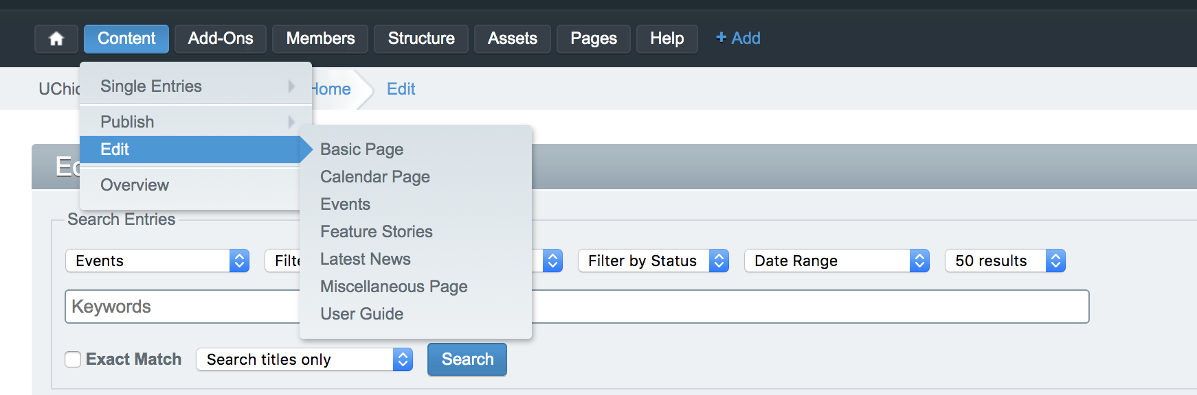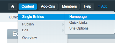 To edit the Homepage, either select it from the main content tree, or select Content > Single Entries > Homepage from the top bar.