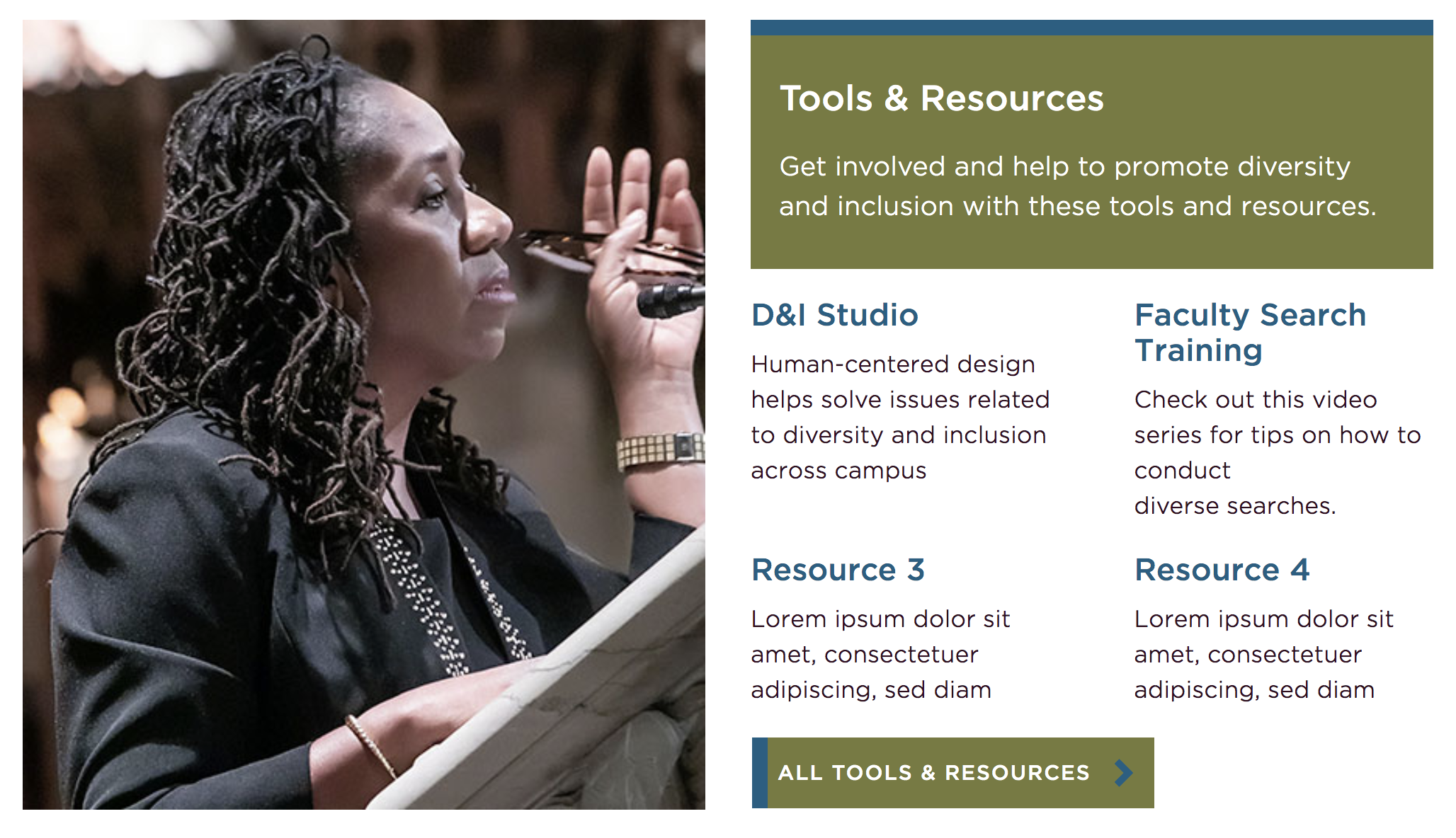 Next is your tools and resources list. This appears below the box containing the headline and intro blurb text and to the right of the headline image. Here you insert a name, which will be larger text, blurb text, and then a link. Again, the link can be for pages within the site or external pages.