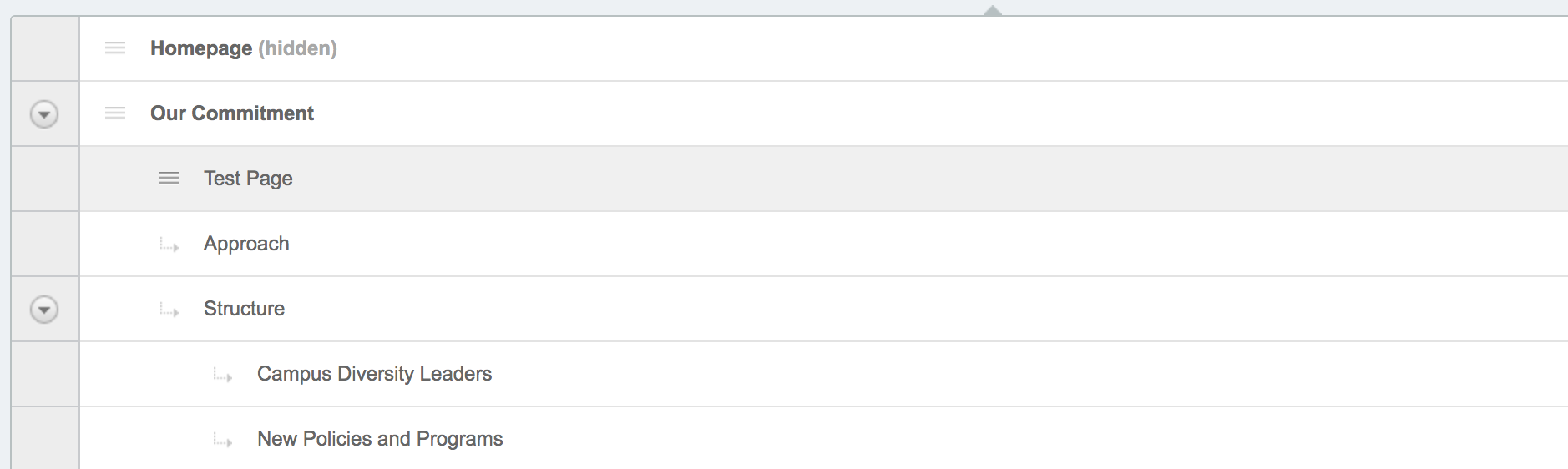 To change the ordering of pages in the navigation or to change a parent/child page relationship, we recommend going to the tree structure view and dragging and dropping. Placing your mouse to the left of the page title will display a black up and down arrow that will allow you to move the page.