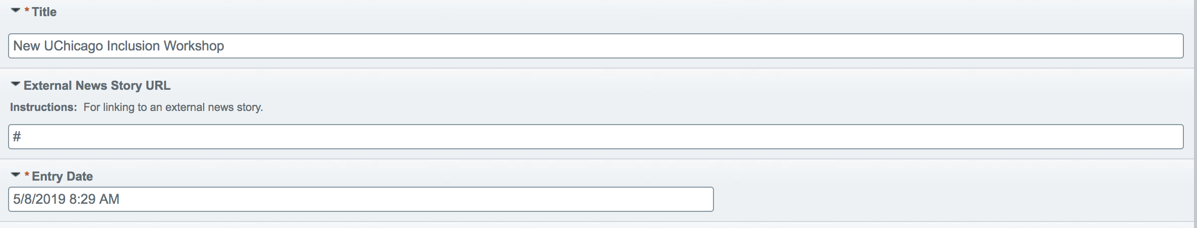 The title is a required field. The external URL should only be used if your news story is on a different site and you're wanting to link to it. The entry date will automatically be filled in with the current date and time of creation, but this can be changed if you wish.