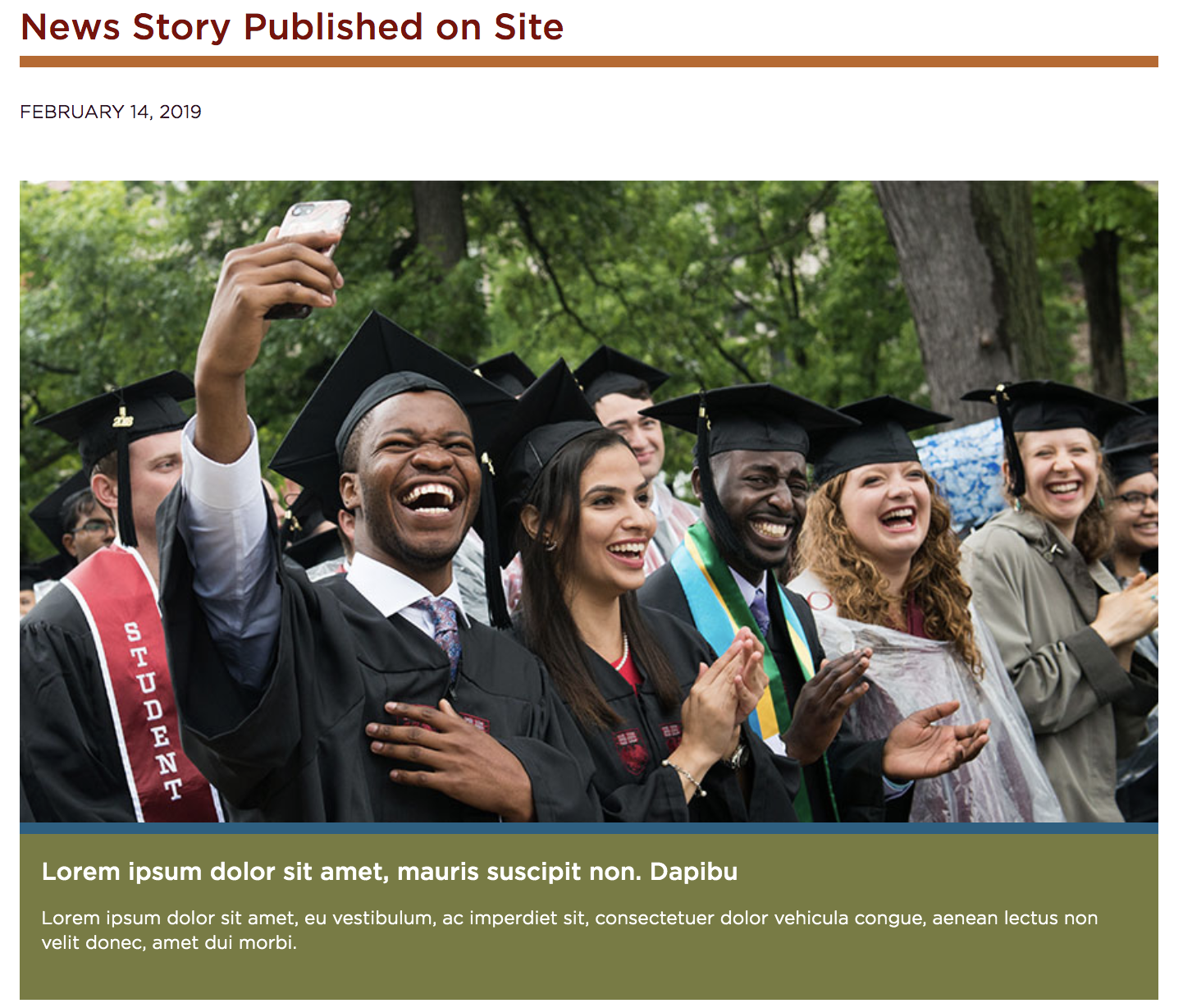 The hero image section will display at the top of the news story with a large image, a heading, and a caption as shown in the image. Multiple images and text can be chosen and a slider will be created. The background color behind the text can be changed.