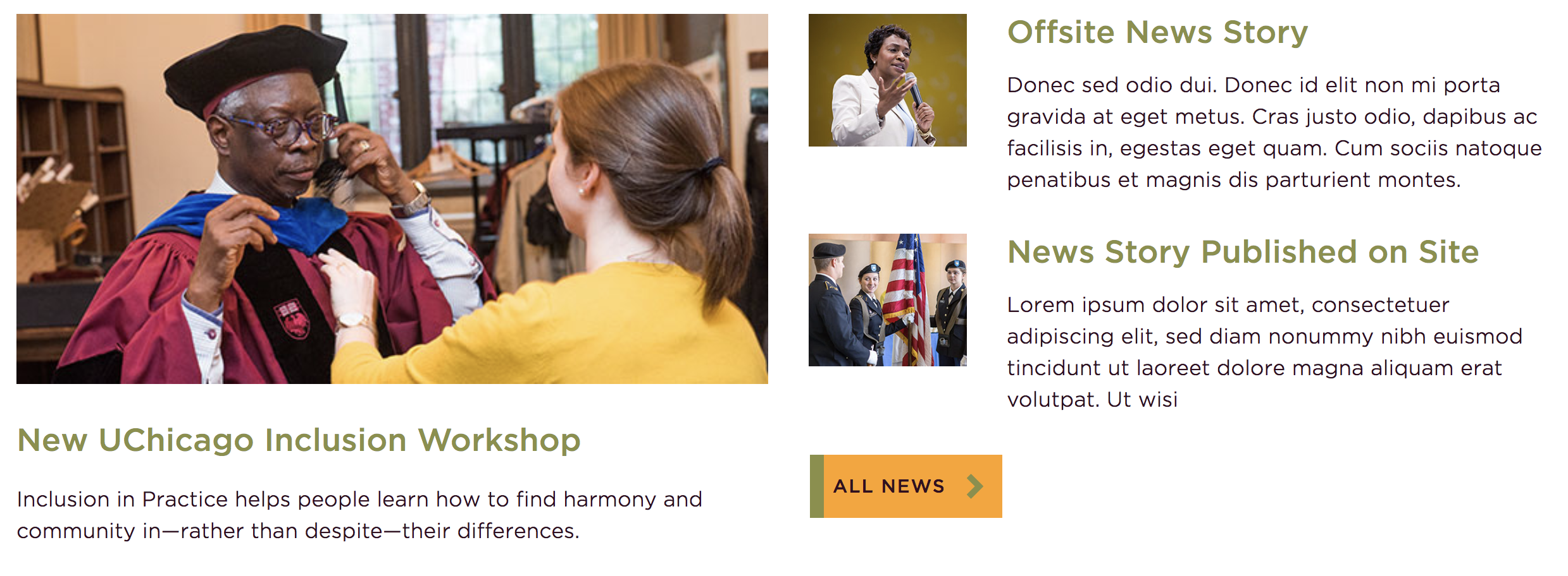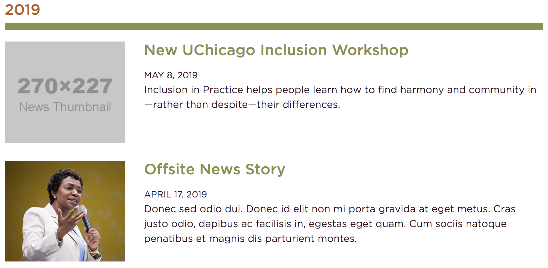 The image shows the news archive with thumbnails, the title, and blurbs being shown.
