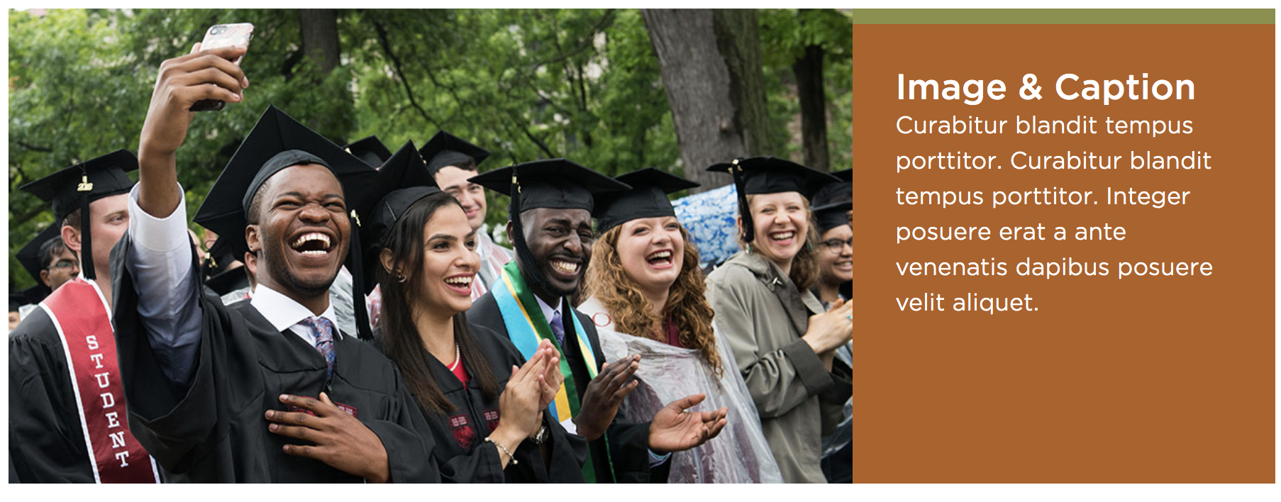 First is the hero image section. This section allows for large images and text. The image will display at the top and a box containing the heading and caption will display below it. If more than one entry is placed, there will be a slideshow of the entries.