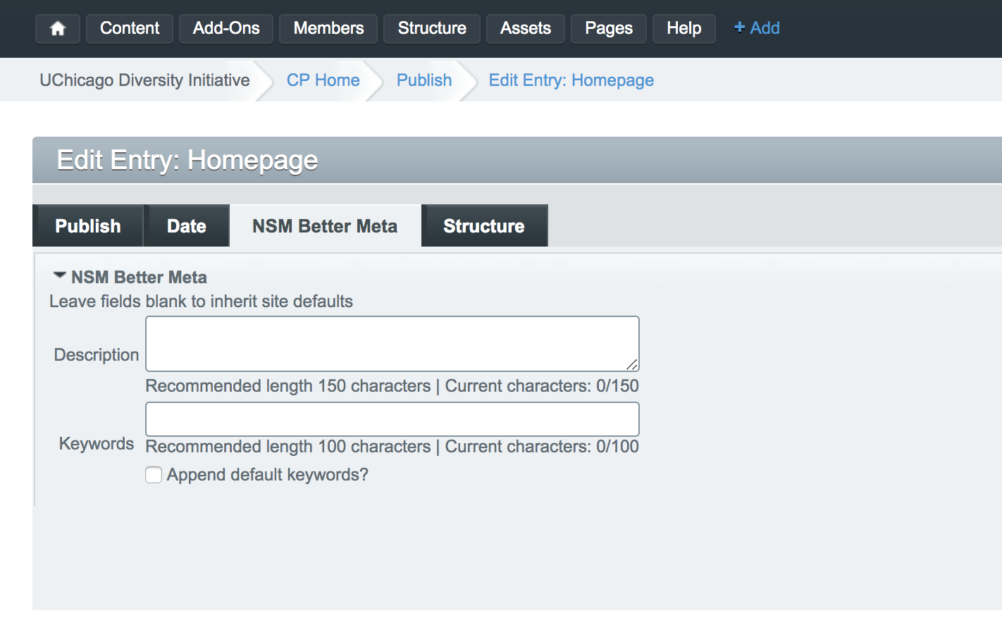 The other tab you may want to use is the NSM Better Meta tab located at the top of the Edit Entry: Homepage page. There is default metadata for your site but here you can insert your own descriptions and keywords for SEO purposes.
