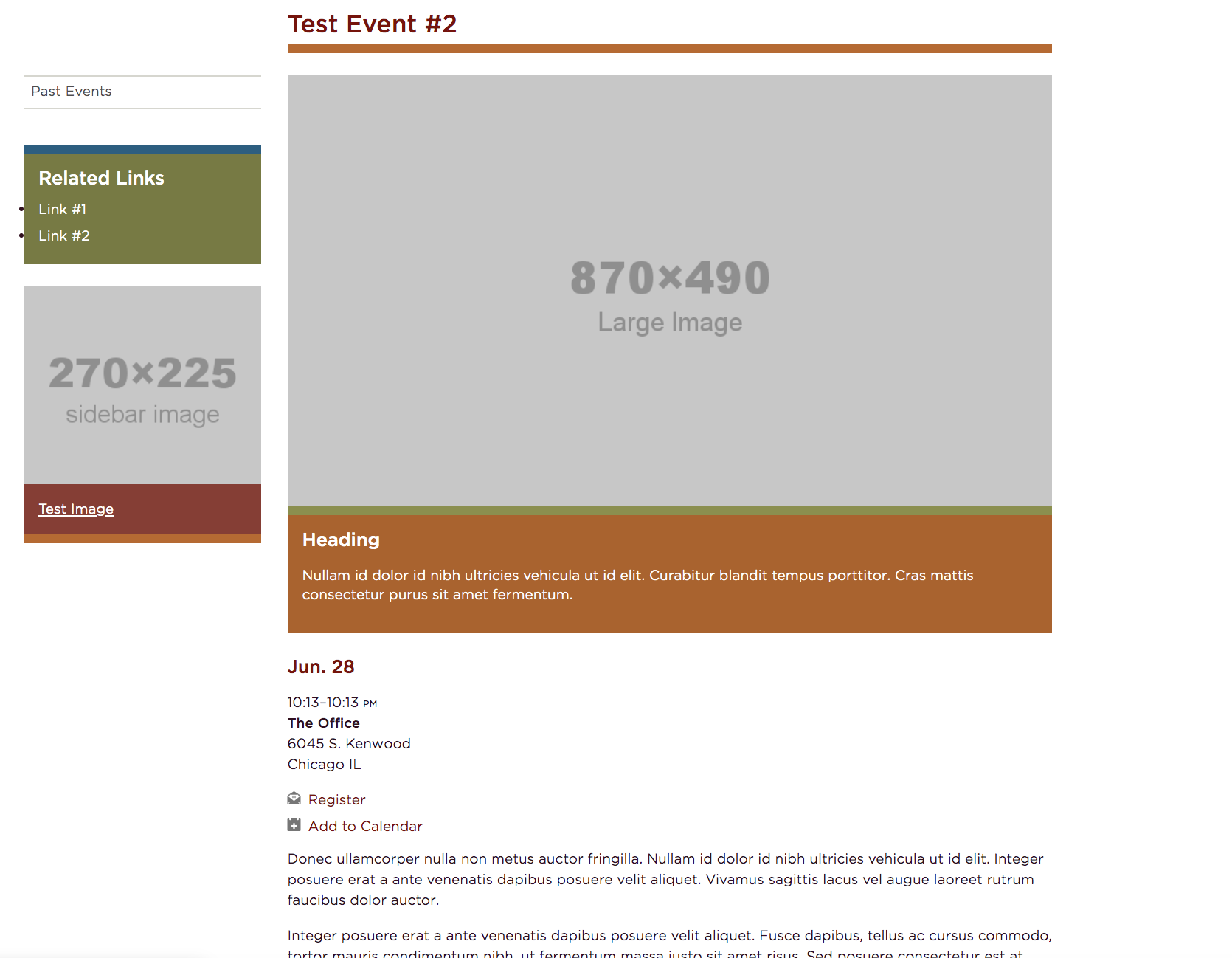 Large image(s) can be inserted and will appear at the top of the page of that event. Multiple can be chosen and a slideshow will be created. The full description is required and will appear on that specific event's page. There are also places to insert sidebar content and a registration form link if needed. This image shows a large image, the event information, sidebar links and a sidebar image.