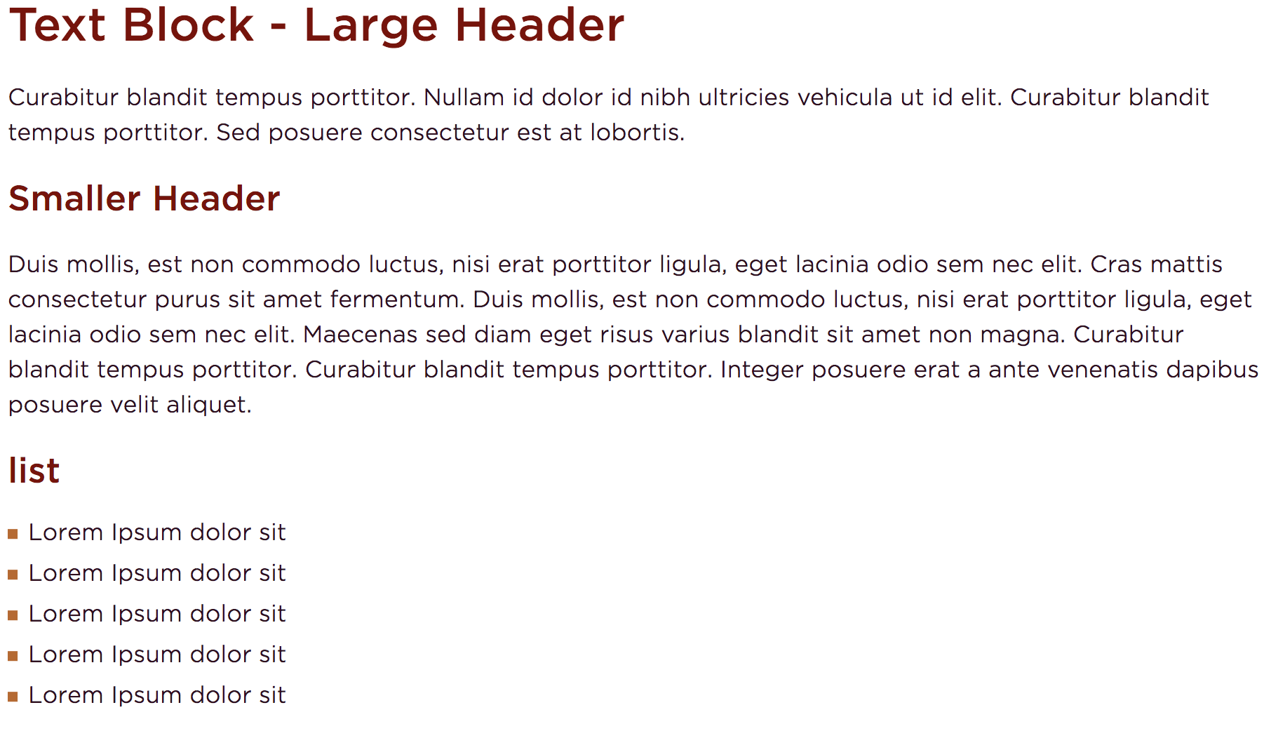 Next is a text content block. You can insert headers of different sizes, paragraph text, lists, links, and symbols. The basic formatting options are along the top bar of the textbox. The image shows how headers and lists would be displayed.